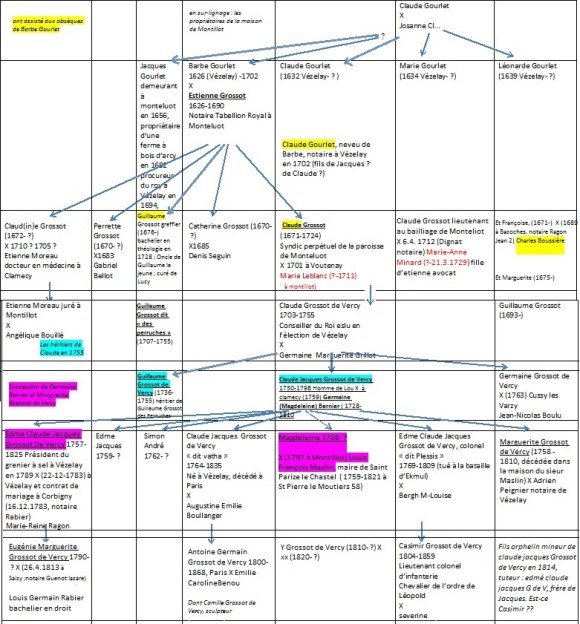 Les sites de généalogie ont permis de dérouler l’arbre généalogique descendant d’Estienne GROSSOT (1626-1690) jusqu’à Edme Claude Jacques GROSSOT DE VERCY (1757- 1825). Les registres paroissiaux de Montillot, Vézelay, et divers villages de l’Yonne et de la Nièvre, ont confirmé et complété ces données.