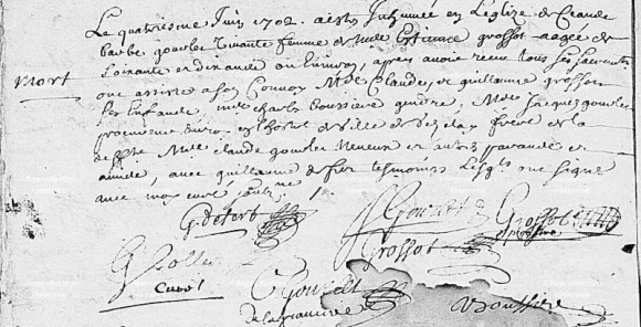 On retrouve à Montillot l’acte de naissance de Claude GROSSOT leur fils (nous diront Claude II), le 15 septembre 1703, ayant pour marraine « honneste fille Claudine GROSSOT », toujours célibataire, et pour parrain noble Claude GOURLET, sieur de la Gravière, « (?) souhaitant rester pour le voyage en l’élection de Vézelay » : il s’agit du neveu de Barbe, notaire et conseiller du roy eslu en l’élection de Vézelay. Guillaume (II) (dit « le jeune »), frère de Claude II, est né en 1707 ; il portera plus tard le nom de Guillaume GROSSOT DES PERRUCHES. Au décès du père les garçons sont émancipés, et l’oncle Guillaume (I), théologien, est leur curateur en 1728.